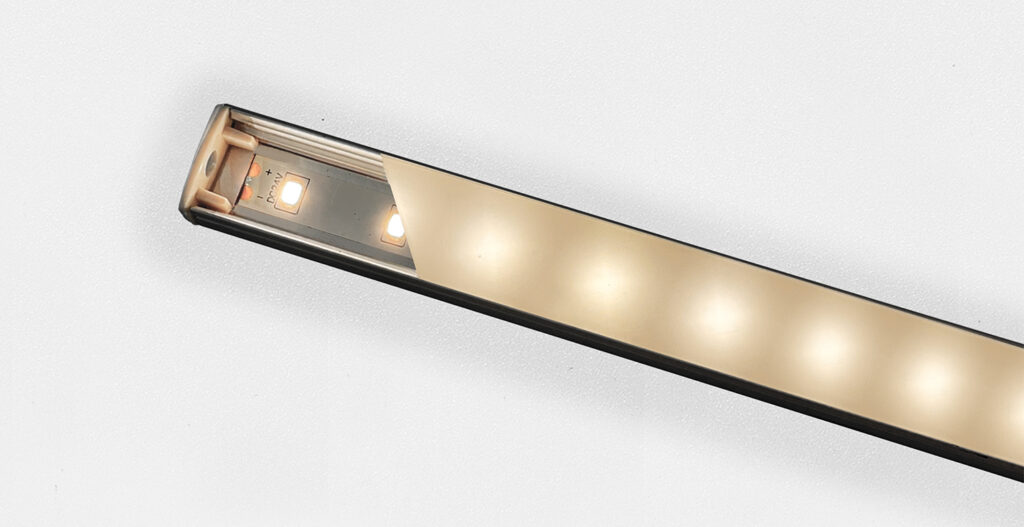 The combination of a low amount of LED chips per metre but with a deeper profile has also produced a typically desirable linear lighting effect.