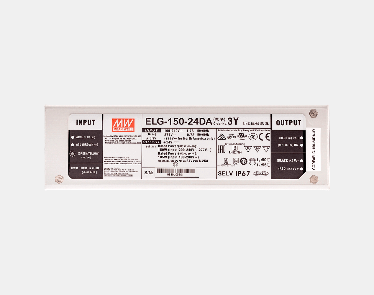 SORTIE Puissance : 150W Tension : 24VDC Courant : 5.6A ENTREE Plage de tension : 100 - 305VAC Fréquence AC : 47 - 63Hz Efficacité : >89% Capacité : 5 - 100% Courant AC : 0.9A Dimensions L219 x l63 x H35.5mm