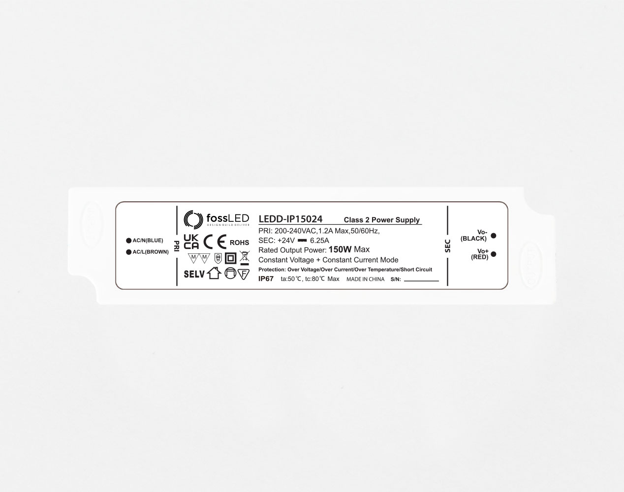 SORTIE Puissance : 150W Tension : 24V Courant : 6.25A ENTREE Plage de tension : 200 - 240VAC Fréquence AC : 47 - 63Hz Facteur de puissance : >0.65 Efficacité : >92% Courant d'appel : 70A Dimensions L190 x l52 x H37mm