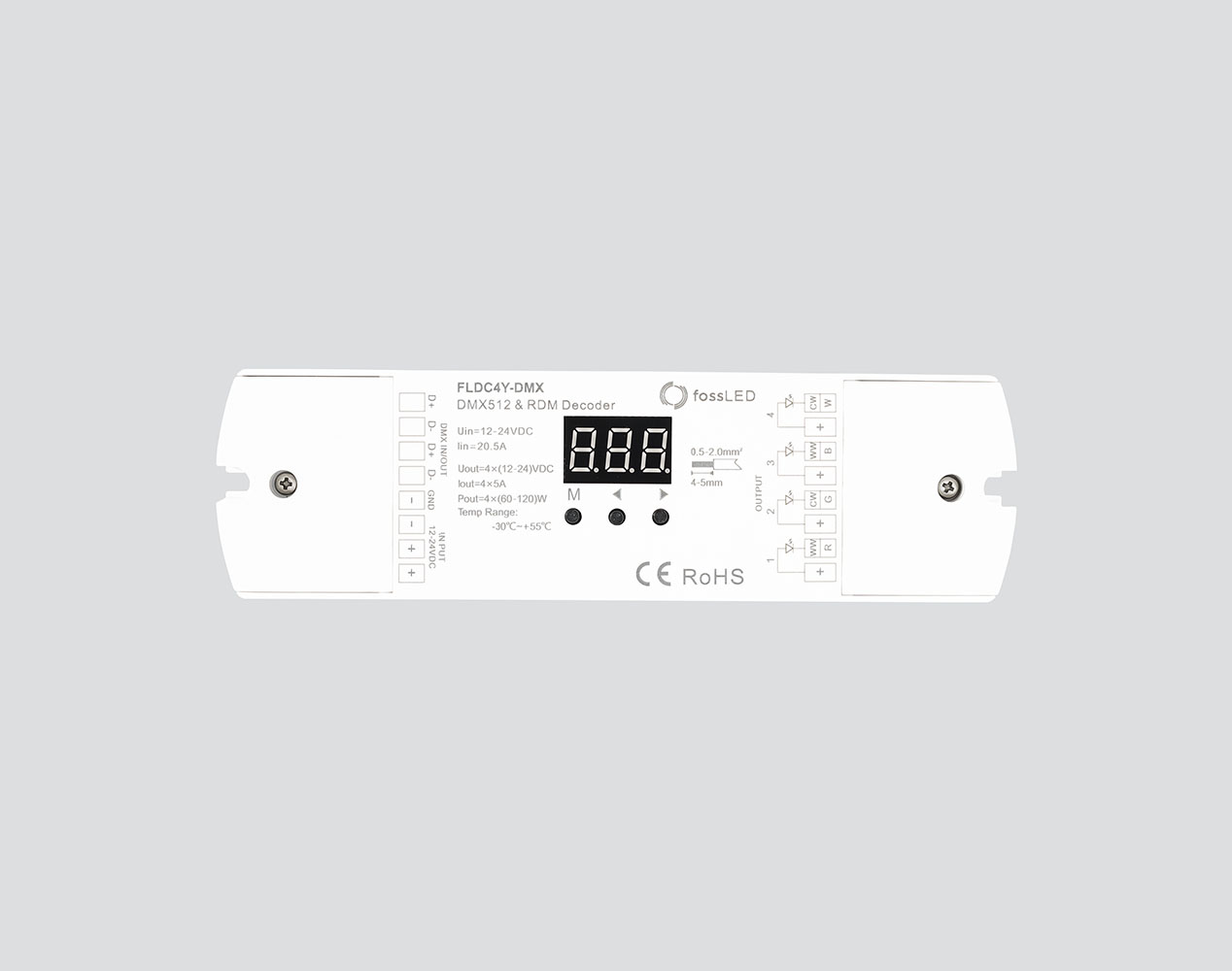 Compatible avec les rubans LED et télécommandes simple couleur, blanc variable, RVB & RVB+B. Il dispose d'un affichage numérique et d'une sélection de touches DMX, de sorties 1/2/4 canaux DMX512